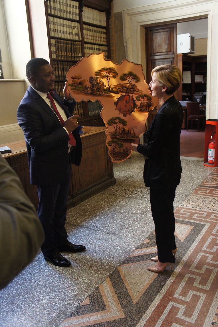 Honorable. El Ministro W. Mzembi entrega un obsequio a la Subsecretaria de Estado italiana de Patrimonio Cultural y Turismo, Dra. Dorina Bianchi